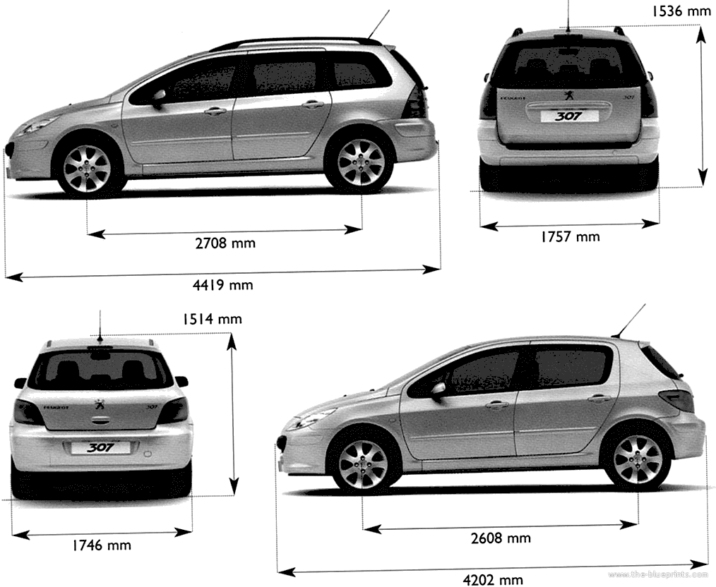 Peugeot 307 SW (2007) - Пежо - чертежи, габариты, рисунки автомобиля